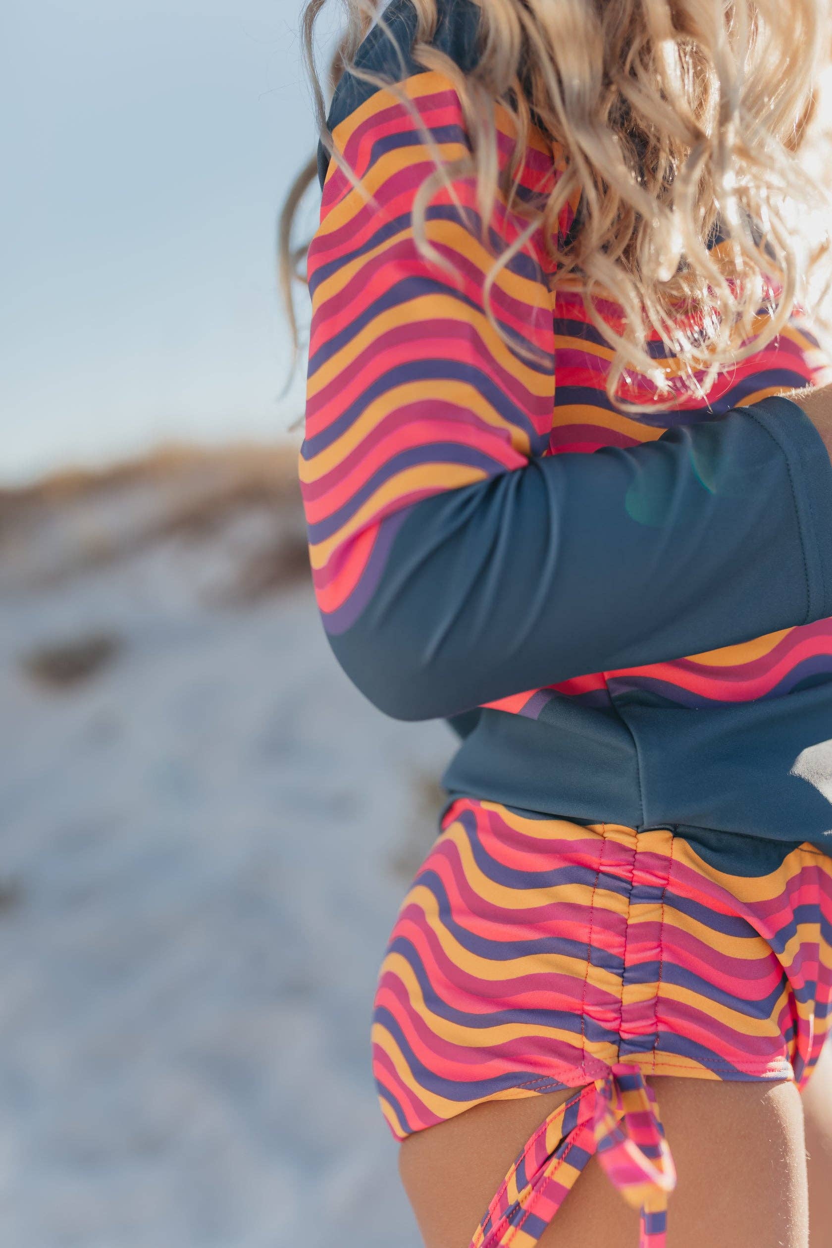 Girls navy and coral wave striped print long sleeve Rash Guard swimsuit. Navy & coral wave striped bottoms with ruched side ties. SPF 50. Double Lined Throughout. Wash on gentle cycle cold wash, hang dry. 85% Polyester, 15% Spandex