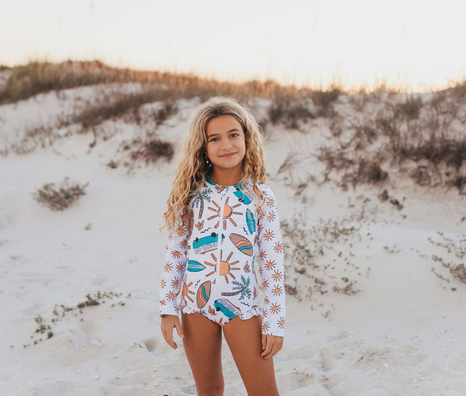 Girls teal, orange, white Hawaiian shaka surf van sun print long sleeve one-piece zip up rash guard with ruffle detail. SPF 50. Double lined throughout. High quality. Wash on gentle cycle cold wash, hang dry. 85% Polyester, 15% Spandex