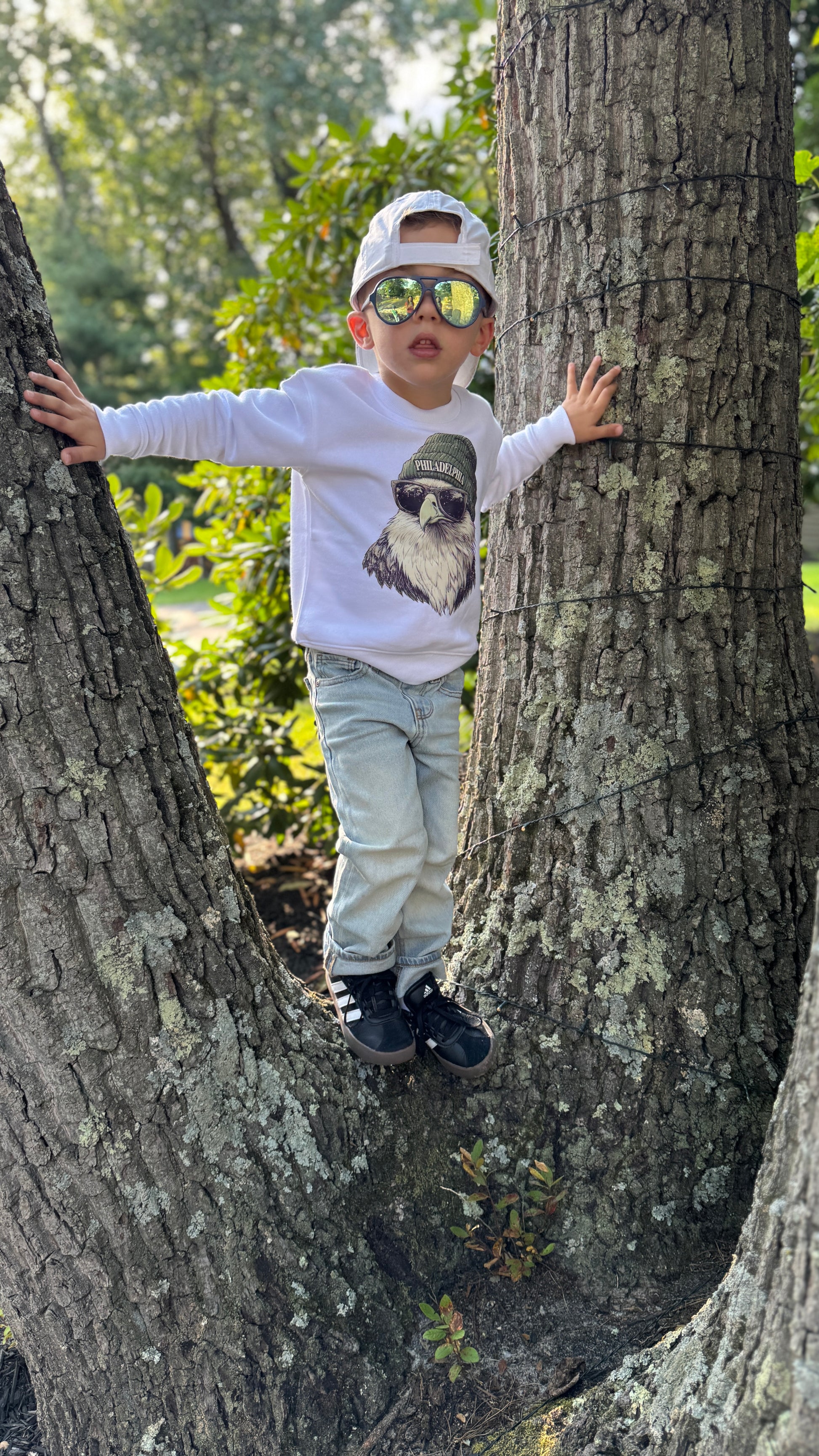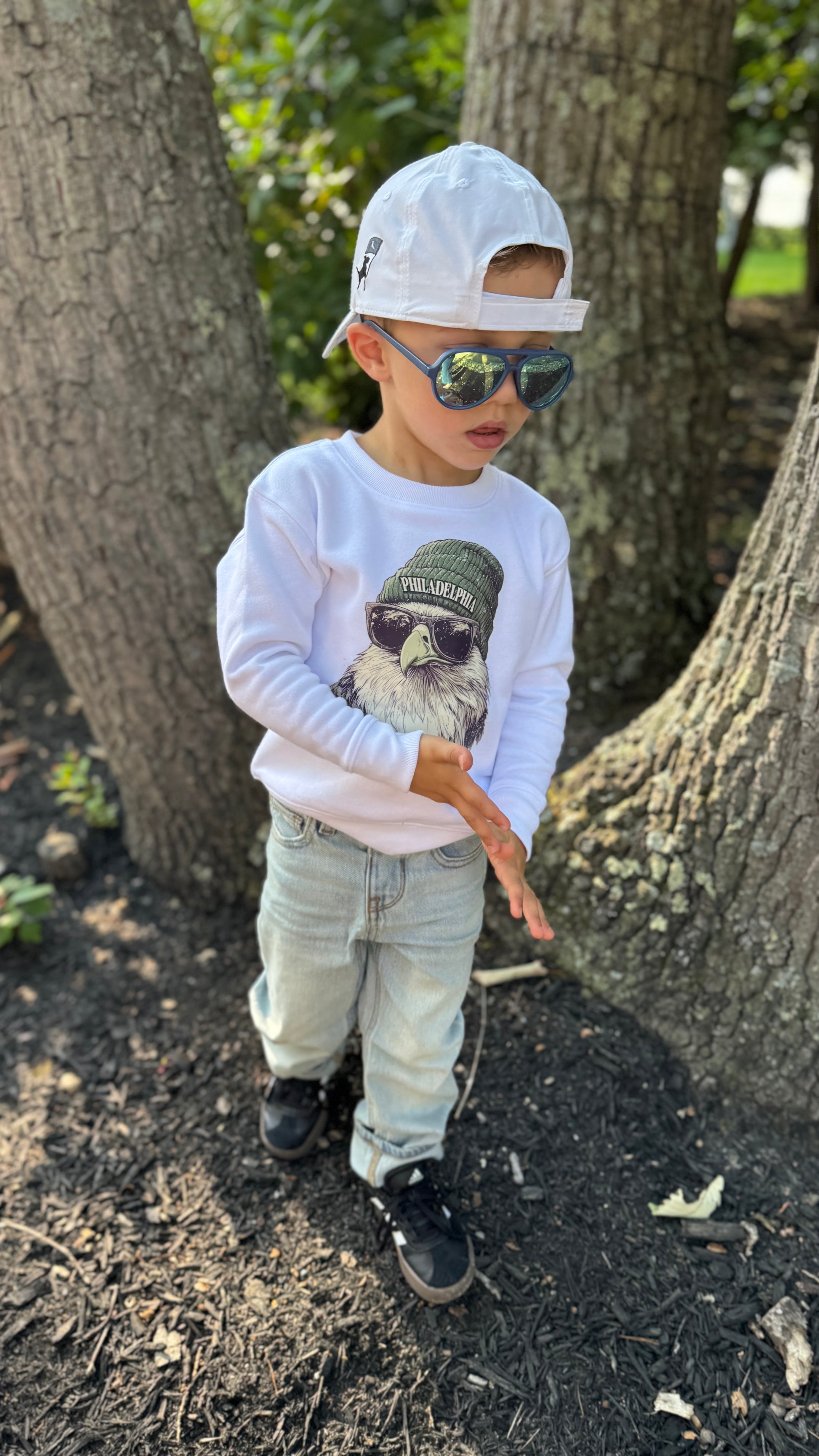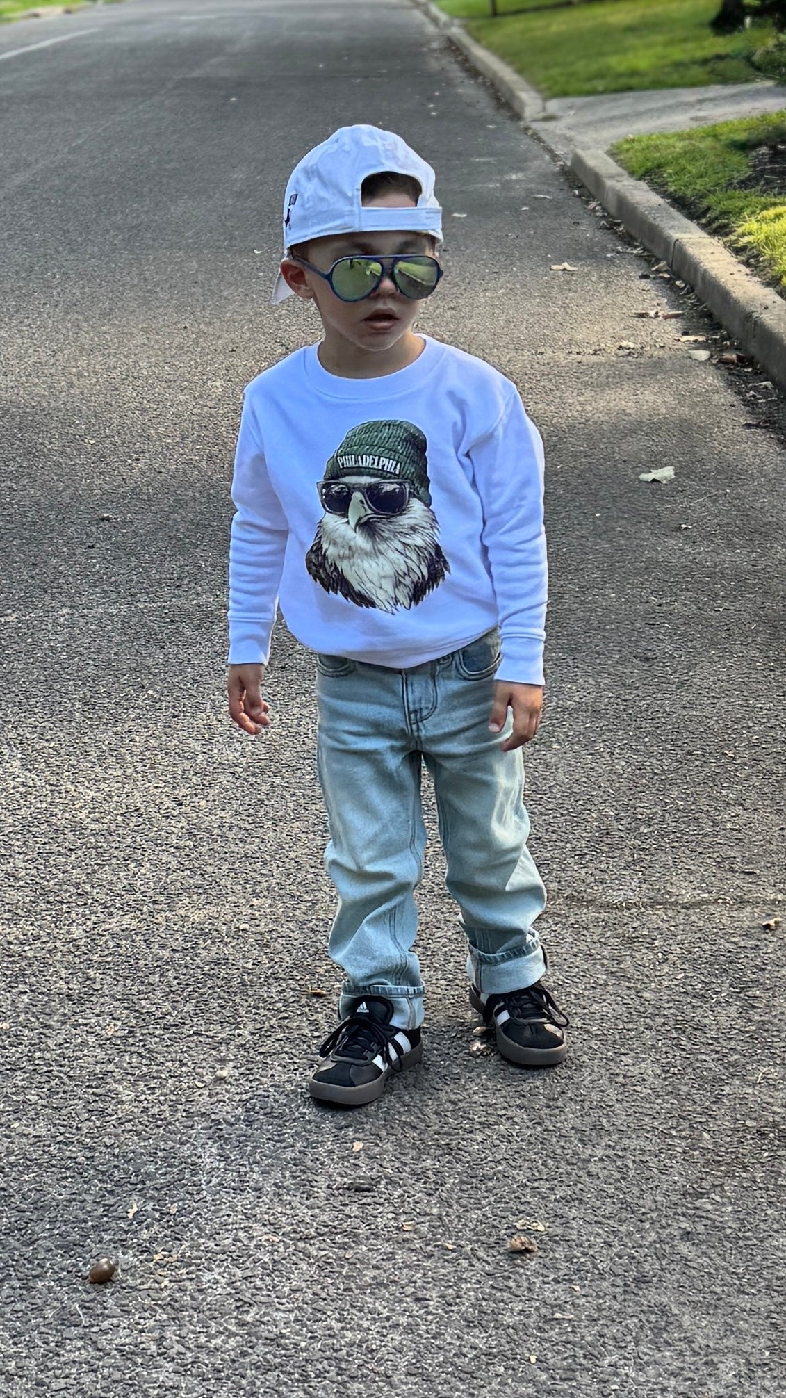 Let your little fan rep Philly in style with this epic Eagles sweatshirt! Featuring a bold eagle graphic decked out in shades and a green beanie that proudly reads Philadelphia, this sweatshirt is the ultimate game-day fit for kids.