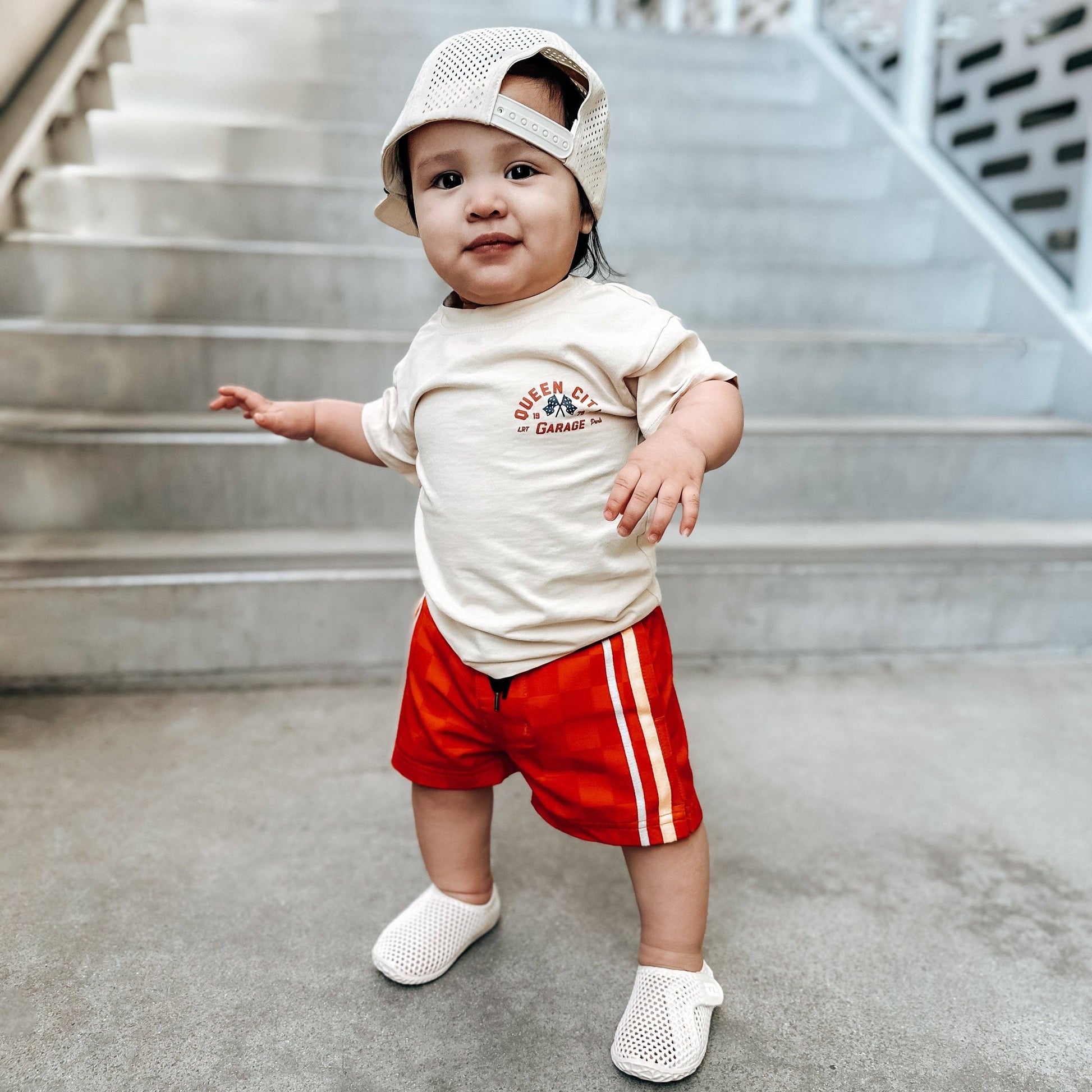 Designed by a boy mom who knows what kids need—these Retro-Wave Hybrid Boardshorts are built for all-day play, from the backyard to the beach. Made with a lightweight, moisture-wicking blend of 92% polyester and 8% spandex, they’re ultra-comfortable, quick-drying, and completely liner-free (because no one likes an annoying liner!). Why You'll Love Them: Hybrid Performance Fabric – Breathable, stretchy, and moisture-wicking for ultimate comfort. No Liner, No Fuss – Say goodbye to itchy, restrictive mesh! Functional Pockets – Side and back pockets to stash treasures and snacks. Elastic Waistband – Easy-on fit with a comfy stretch. Retro-Inspired Vibes – A bold rad/orange checkerboard print with contrast ribbing down the sides.